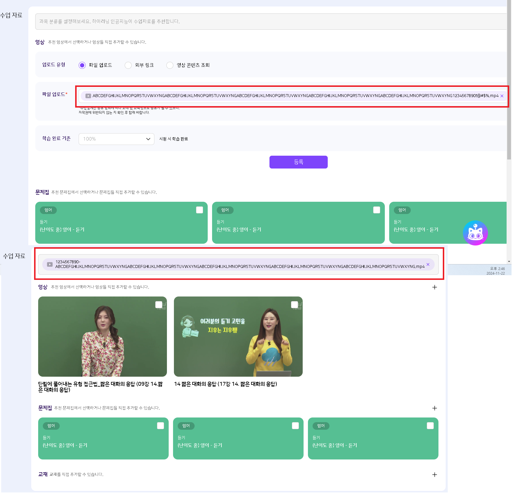 | Steps To Reproduce | 1. 나의학교>나의수업>수업설계>수업자료 2. 영문으로 시작하는 파일명의 길이가 긴 영상 직접등록 | ||||