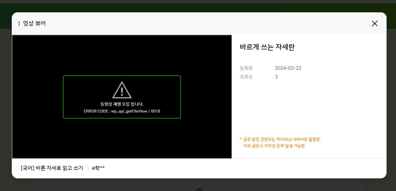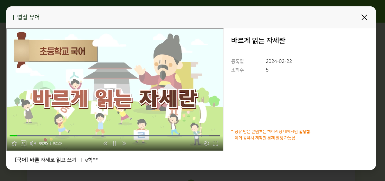| Steps To Reproduce | 1. 교사/학생 로그인 2. 학습 콘텐츠 > 영상 > e학습터 3. 임의의 영상 클릭 ex) 분류 : 초등학교 과정/1학년/국어/바른 자세로 읽고 쓰기 | ||||