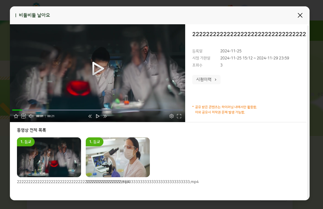 | Steps To Reproduce | 1. 교사 로그인 2. 나의 학교 > 나의 수업 3. 과목 개설하기 > 수업 설계 4. 과목 상세 > 동영상 보기 클릭 5. 동영상 전체 목록 > 영상 제목들 확인 | ||||