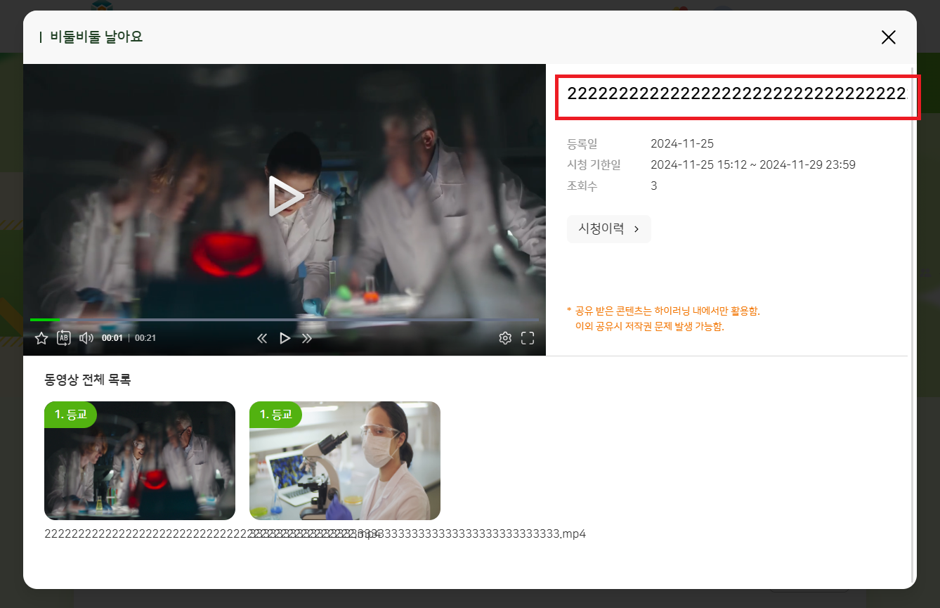 | Steps To Reproduce | 1. 교사 로그인 2. 나의 학교 > 나의 수업 3. 과목 개설하기 > 수업 설계 4. 과목 상세 > 동영상 보기 클릭 5. 상단 영상 제목 확인 | ||||