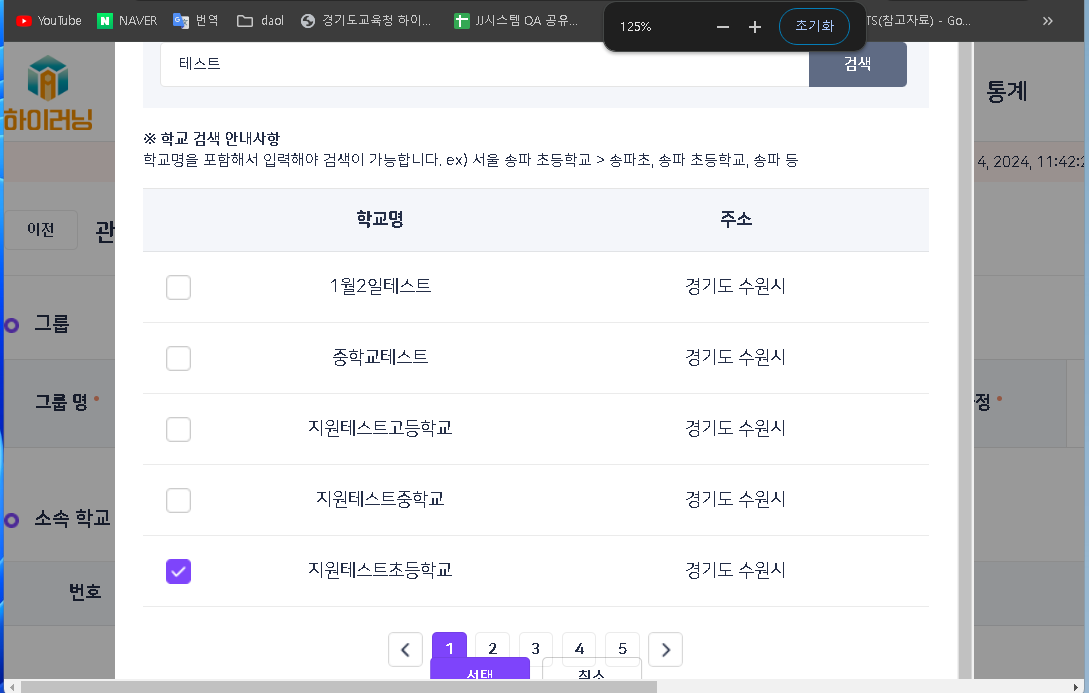 | Description | 플랫폼BO>학교관리>관리그룹정보>그룹등록>추가>학교검색시 학교 리스트가 5건이 노출된 상태에서 화면 배율이 높아지면 페이지 이동 버튼과 선택취소 버튼 UI충돌 발생 | ||||