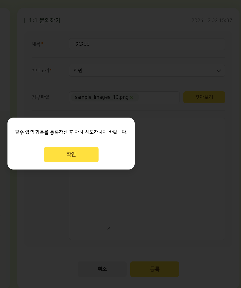 | Description | 1:1 등록 모든 내용 입력 후 등록 버튼 클릭 시 에러 팝업창 노출 | ||||