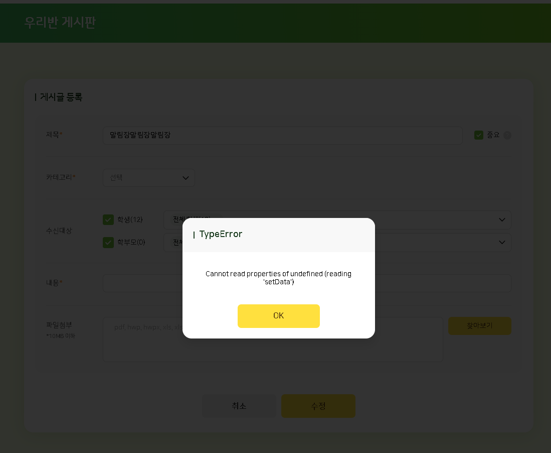 | Description | 우리반 게시판 게시글 수정 페이지 진입 시 에러 팝업 노출됨 | ||||