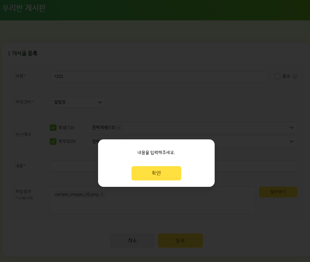 | Description | 우리반 게시판 게시글 등록 안됨. 에러 팝업 노출 | ||||