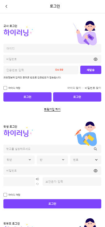 | Description | [모바일] 로그인 버튼 클릭 시 교사, 학생, 학부모 로그인 화면이 한번에 노출되는 현상 | ||||