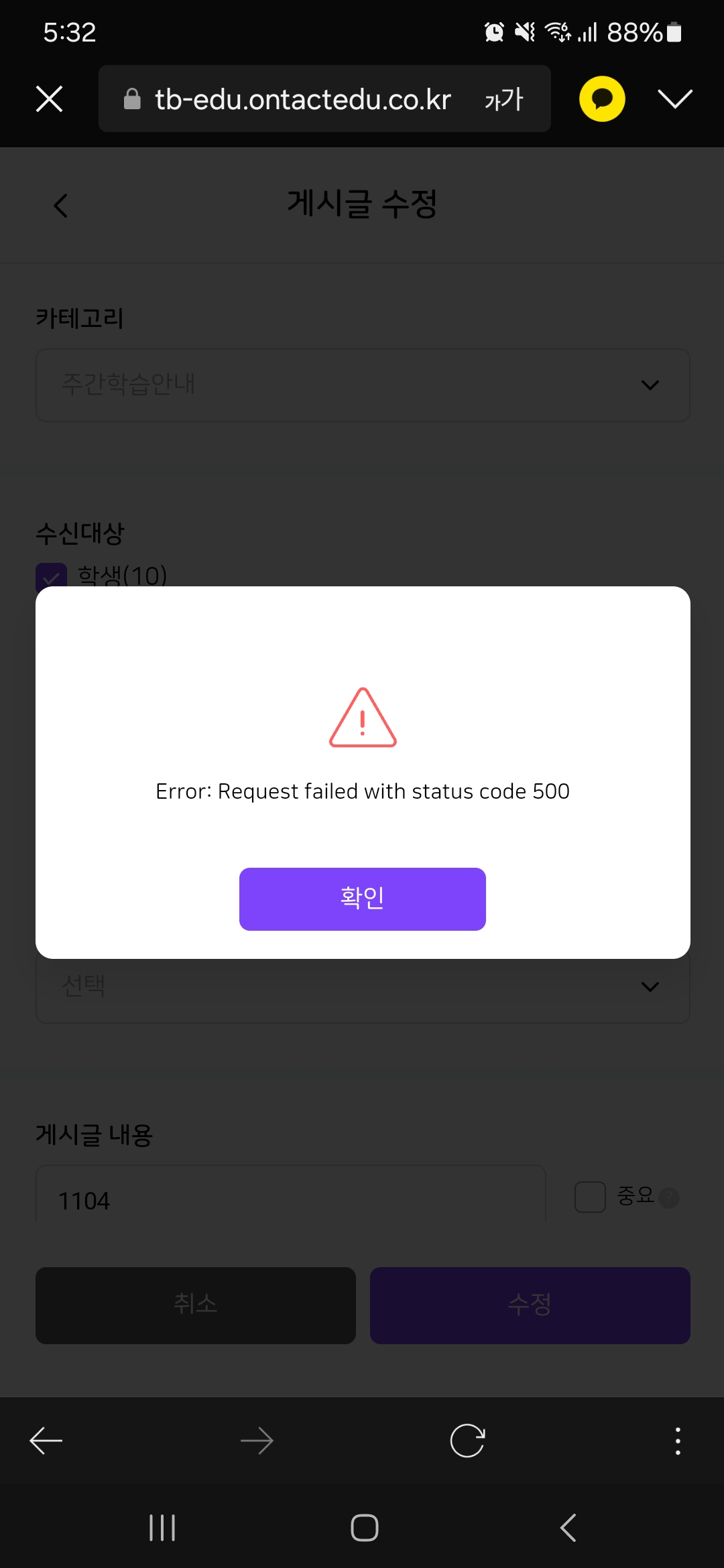| Description | 모바일로 우리반게시판 게시글 수정시 에러팝업 노출 | ||||