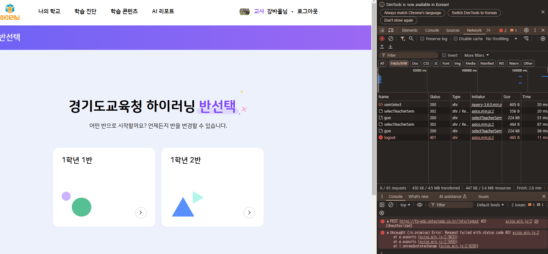 | Steps To Reproduce | 1. 일반모드 복수 담임 로그인 2. 시크릿 모드 복수 담임 중복 로그인 후 기존 접속자 로그아웃 선택 3. 일반모드 복수 담임 반 선택 화면 클릭 및 로그아웃 버튼 | ||||