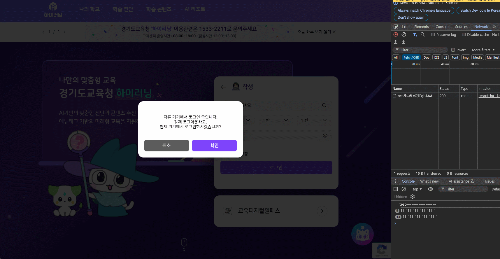 | Steps To Reproduce | 1. 일반모드 - 학생 로그인 2. 시크릿모드 - 동일 학생 로그인 3. 중복 로그인 팝업에서 [ 취소 ] 버튼 클릭 | ||||