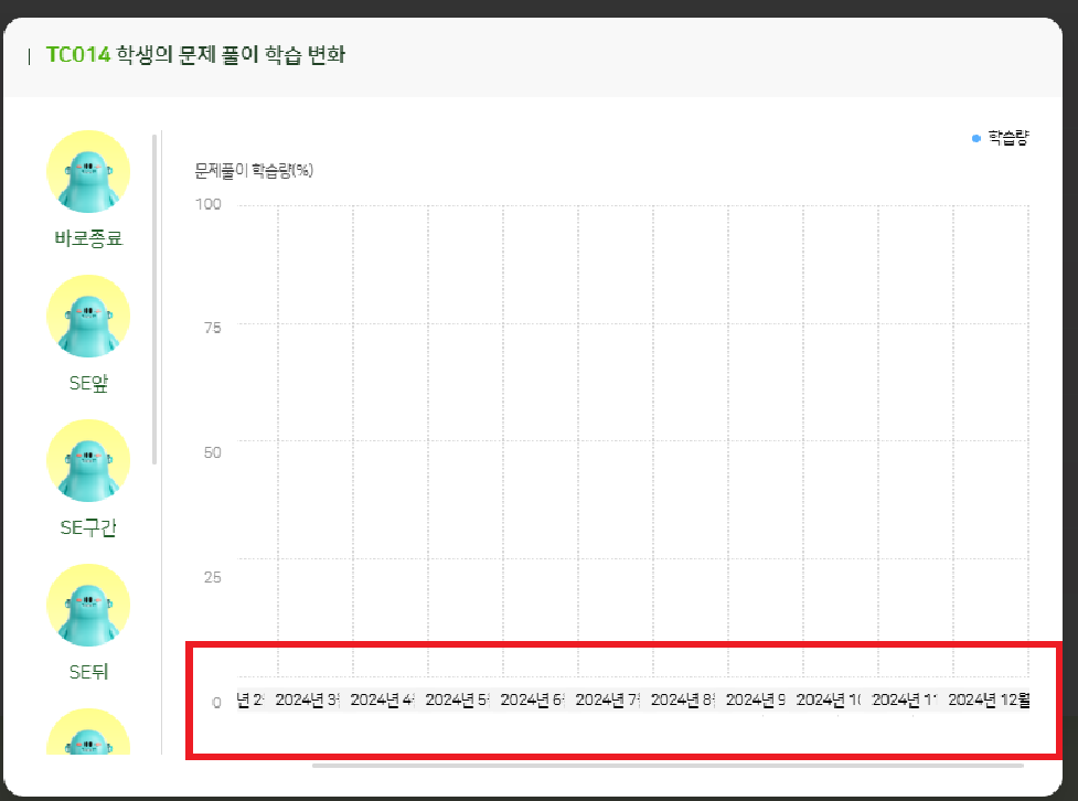 | Description | 학생 리포트 - 학생의 문제 풀이 학습 변화 화면에서 하단 월 표기에 년도가 같이 표기되어 텍스트가 겹치는 현상 | ||||