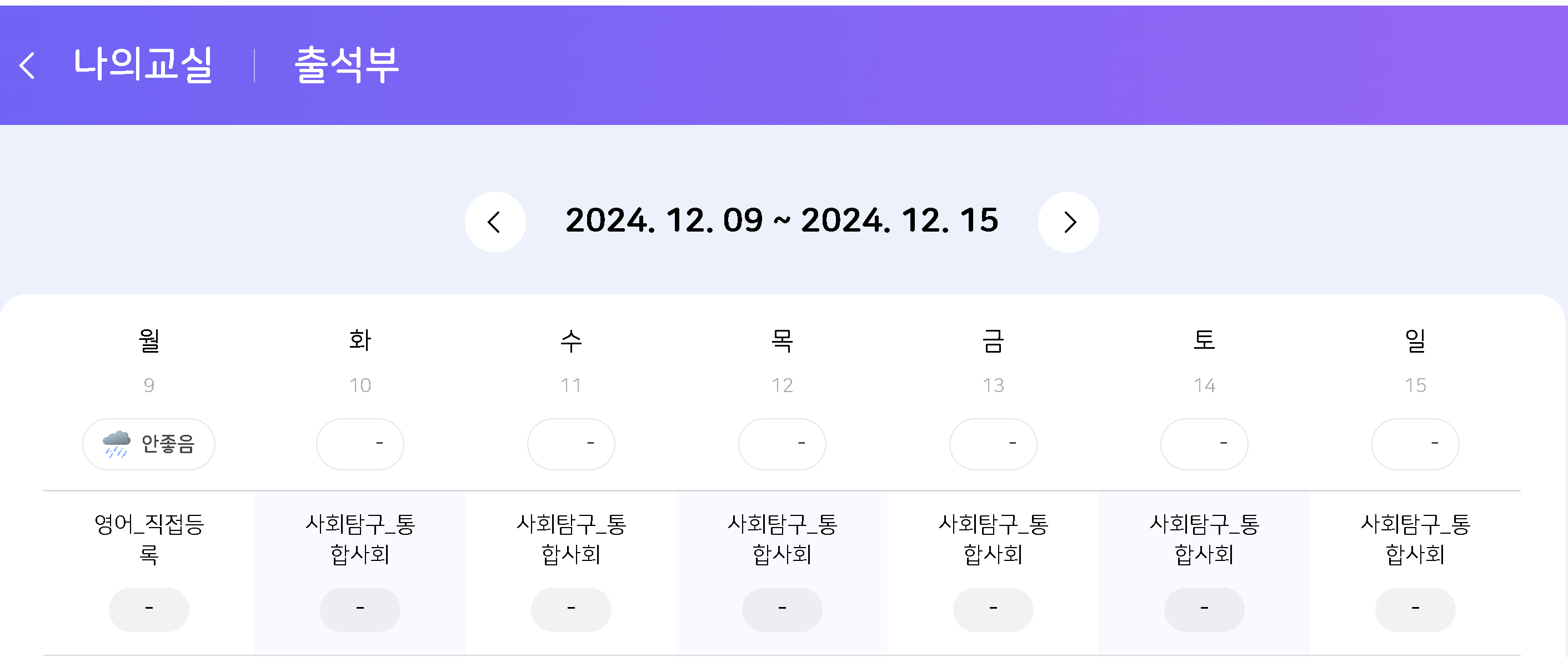 | Steps To Reproduce | 1. 학생 로그인>나의학교>나의교실>이번주출석부[>]클릭>출석부 | ||||