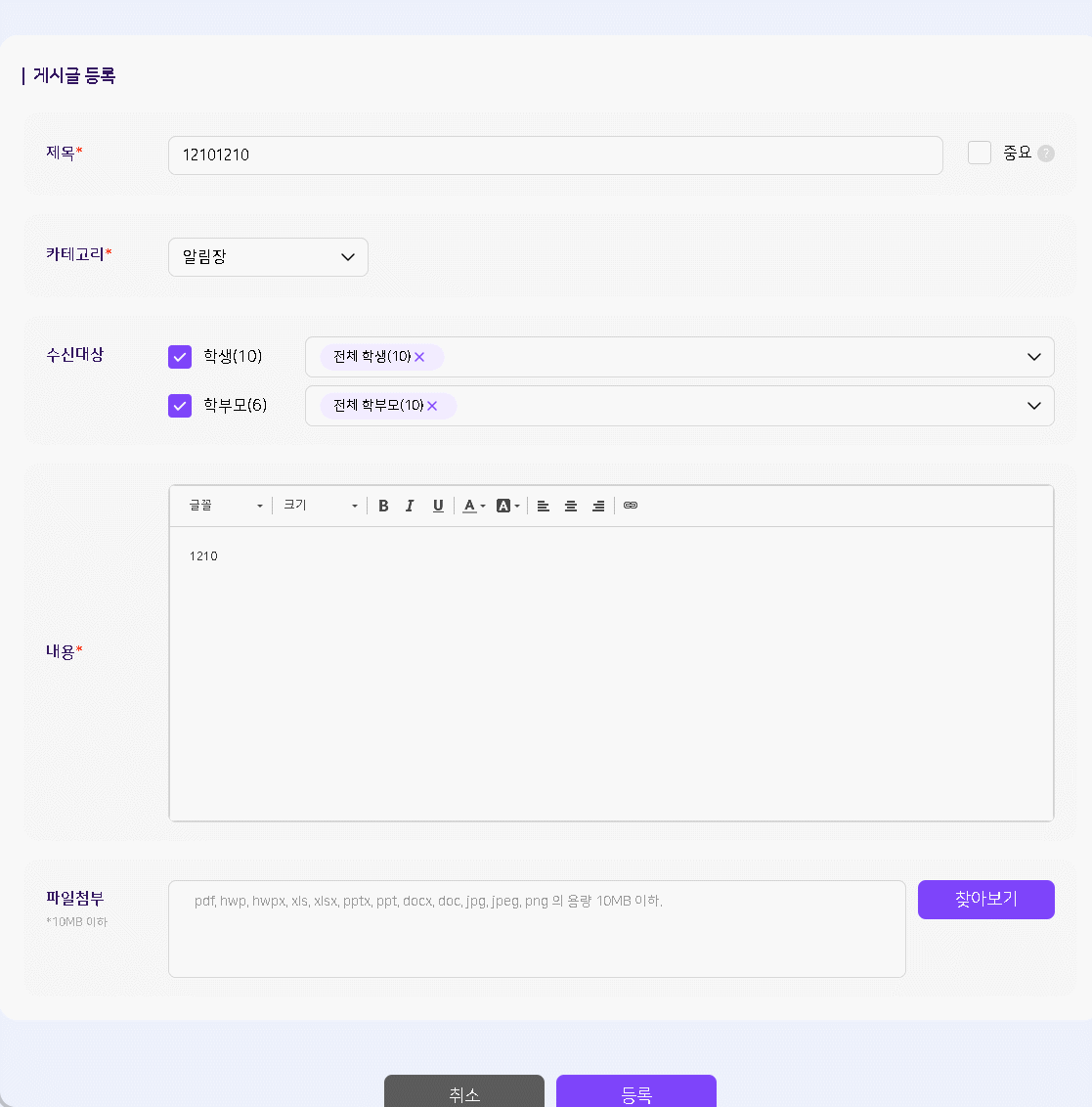 | Summary | 0000344: 우리반 게시판 게시글 수정하기 페이지 진입 시 수신대상 부분이 등록할때 숫자가 아닌 전체 숫자 노출됨 | ||||