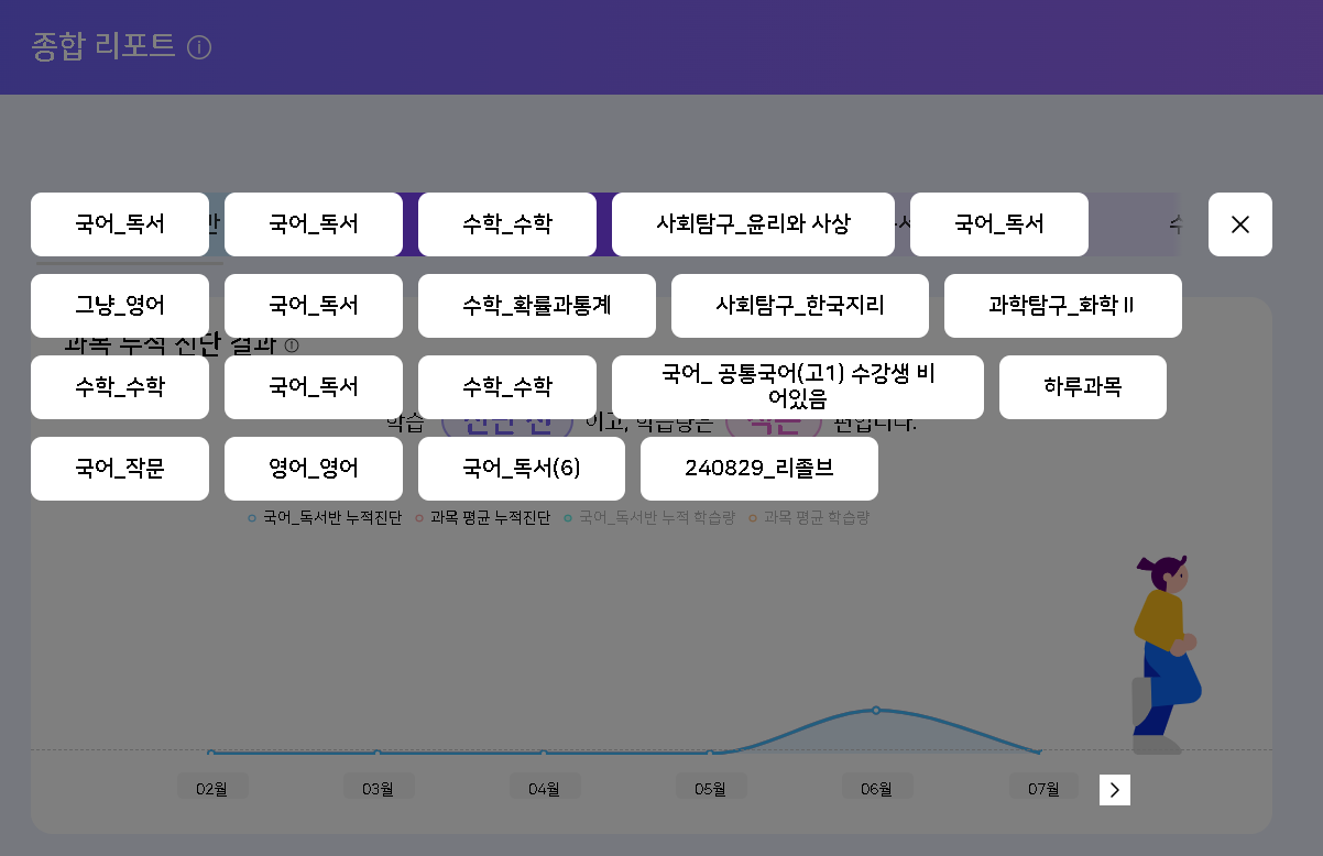 | Summary | 0000035: AI리포트>종합리포트 과목탭 추가하기 클릭시 "전 과목 누적 진단 결과" 화면 이동 버튼 활성화되는 현상 | ||||