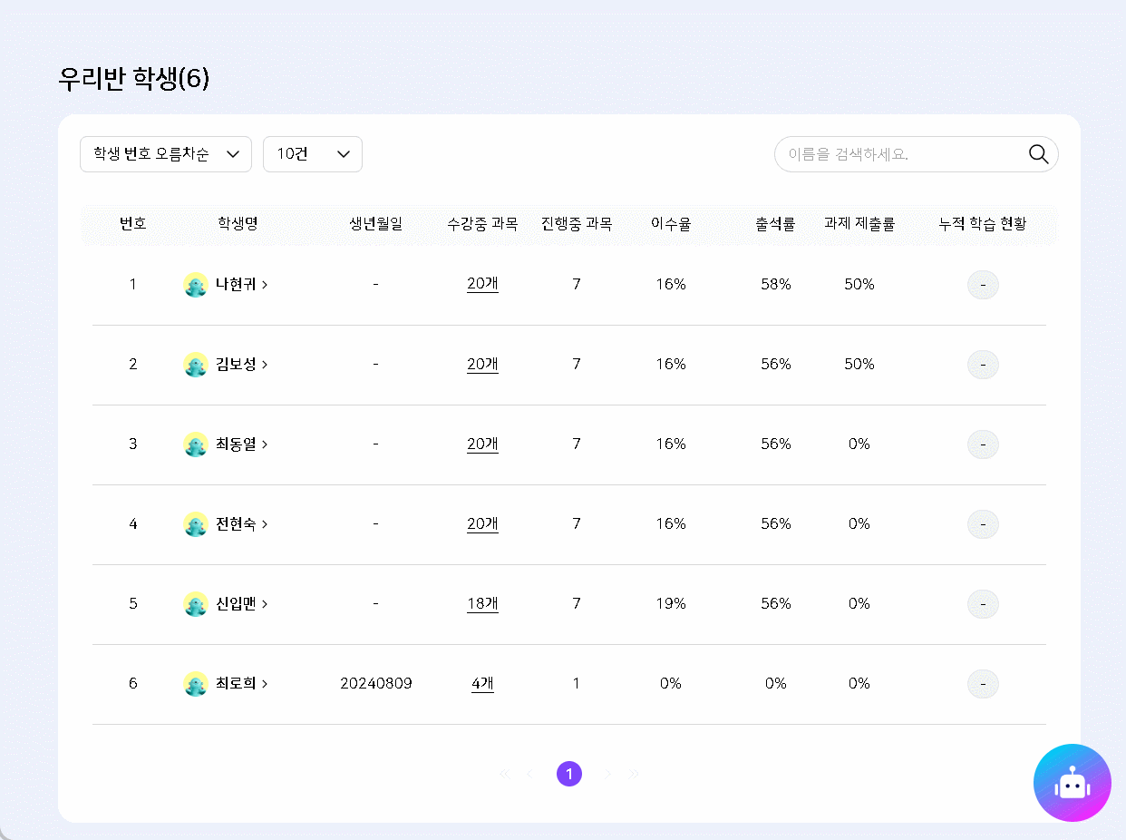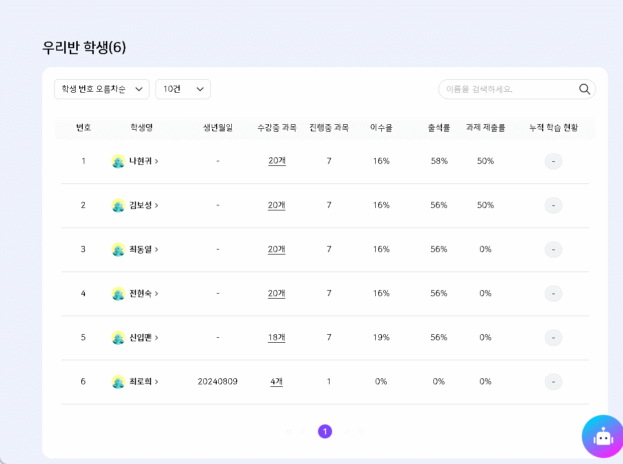 | Description | 1. 우리반 학생 리스트에서 특정학생(*추가정보 확인) 검색 후 입력글자 삭제시 다소미흡 태그 지속 노출되는 현상 2. 우리반 학생 리스트 건수 드롭다운 동작시 누적 학습 현황에 다소미흡 태그가 깜박이는 현상 | ||||