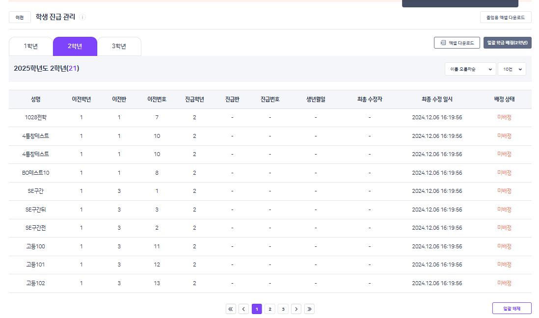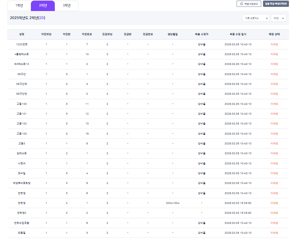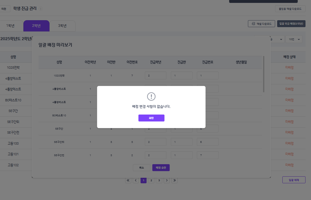 | Steps To Reproduce | 1. 알1고등학교 학교BO 진입 2. 학생 배정 > 학생 진급 관리 3. 2학년 학생 엑셀 다운로드 후 일괄 학급 배정 진행 | ||||
