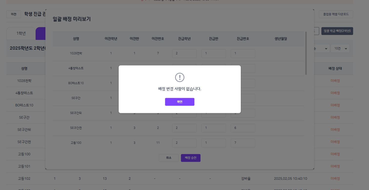 아 이 디 : thytest3 비밀번호 : gkdl123!@# 하림중학교 위 계정에서도 동일 증상 발생합니다. 1. 일괄배정 미리보기에서 배정하기 한번 클릭시 반응 없음 2. 한 번 더 클릭 시, '배정변경 사항 없습니다.' alert 3. 진급반, 진급번호 반영안됨 |