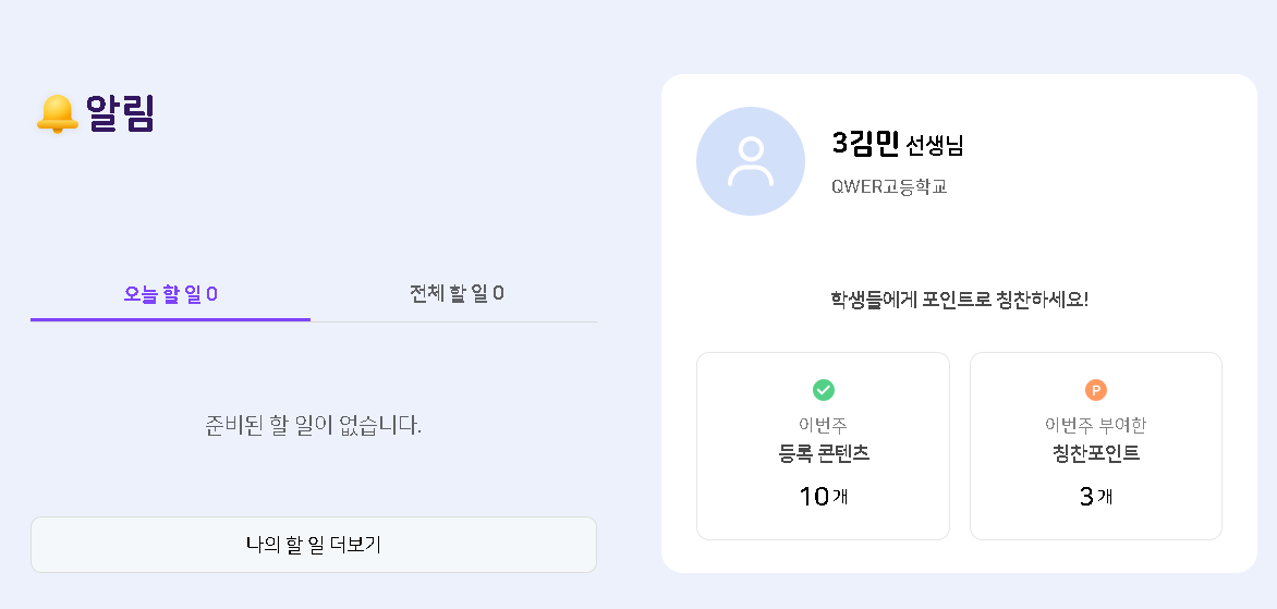 | Description | 학년도 전환 후 최초 진입 했는데 메인 화면에 "이번주 부여한 칭찬포인트"는 초기화 되지 않고 노출되고 있음. | ||||