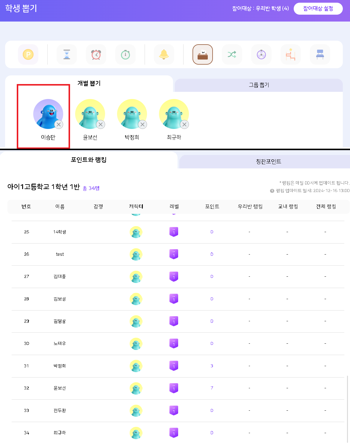| Steps To Reproduce | 1. 교사 로그인 2. 우리반 포인트와 랭킹 페이지 이동 3. 화면 공유 기능(학생뽑기, 학생섞기, 룰렛, 사다리타기) 클릭 4. 기본 설정된 참여대상 확인 | ||||