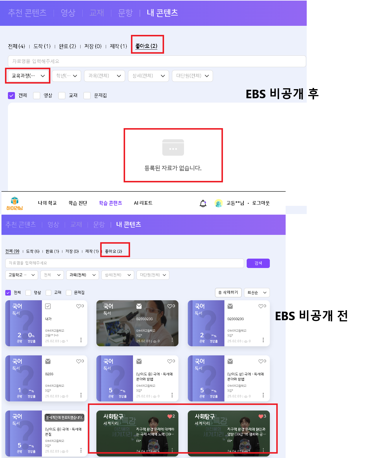 | Description | "좋아요" 했던 EBS 콘텐츠 비공개로 전환 이후 콘텐츠는 노출 안되는데 좋아요는 해제 안되는 현상 | ||||
