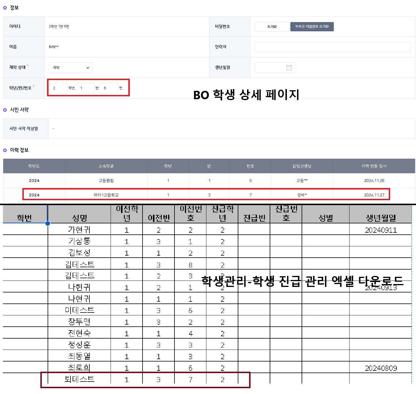 | Summary | 0000411: A학교 → B학교 → A학교 형태로 전학간 학생이 학년도 진급 세팅에서 복사되는 현상 | ||||