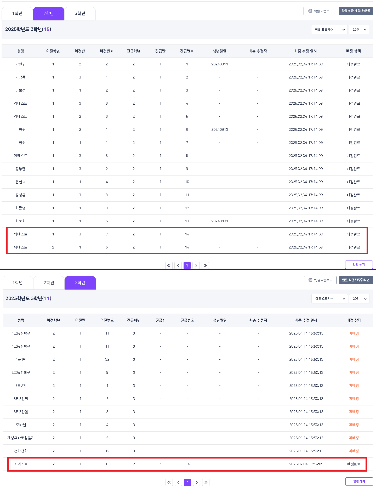 | Steps To Reproduce | 1. 아이1고등학교의 학교BO 접근 (watest9) 2. 계정 관리 > 학생에서 "퇴테스트" 검색 3. 25년도 학생 진급 관리 2학년, 3학년에서 "퇴테스트" 학생 확인 | ||||