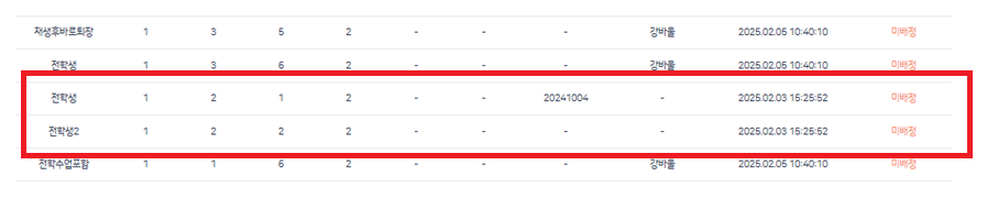 | 2025-02-04 10:25 | 김소원 | Summary | 전학 갔다가 다시 돌아온 학생 학년도 전환-학생진급 관리에서 => A학교 → B학교 → A학교 형태로 전학간 학생이 학년도 진급 세팅에서 복사되는 현상 |