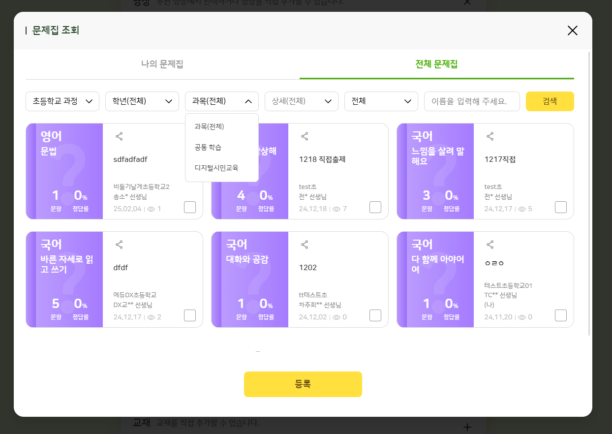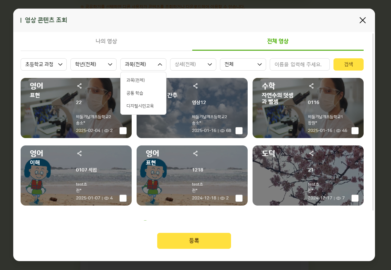 | Steps To Reproduce | 1. 교사 로그인 2. 나의 학교 > 나의 수업 > 수업 설계 3. 수업 자료 > 영상 > 영상 콘텐츠 조회 > 과목(전체) 필터 클릭 수업 자료 > 문제집 > 문제집 조회 > 과목(전체) 필터 클릭 | ||||