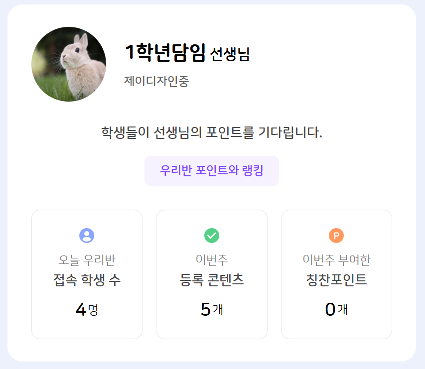| Steps To Reproduce | 1. 교사 데시보드 - 오늘 우리반 접속 학생 수 응시 2. 학급 경영도구 - 포인트와 랭킹에 학생 감정 아이콘 응시 | ||||
