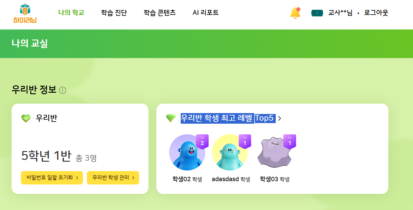 | Steps To Reproduce | 1. 교사 로그인 2. 나의 교실 3. 우리반 정보 4. 우리반 학생 최고 레벨 Top5 | ||||