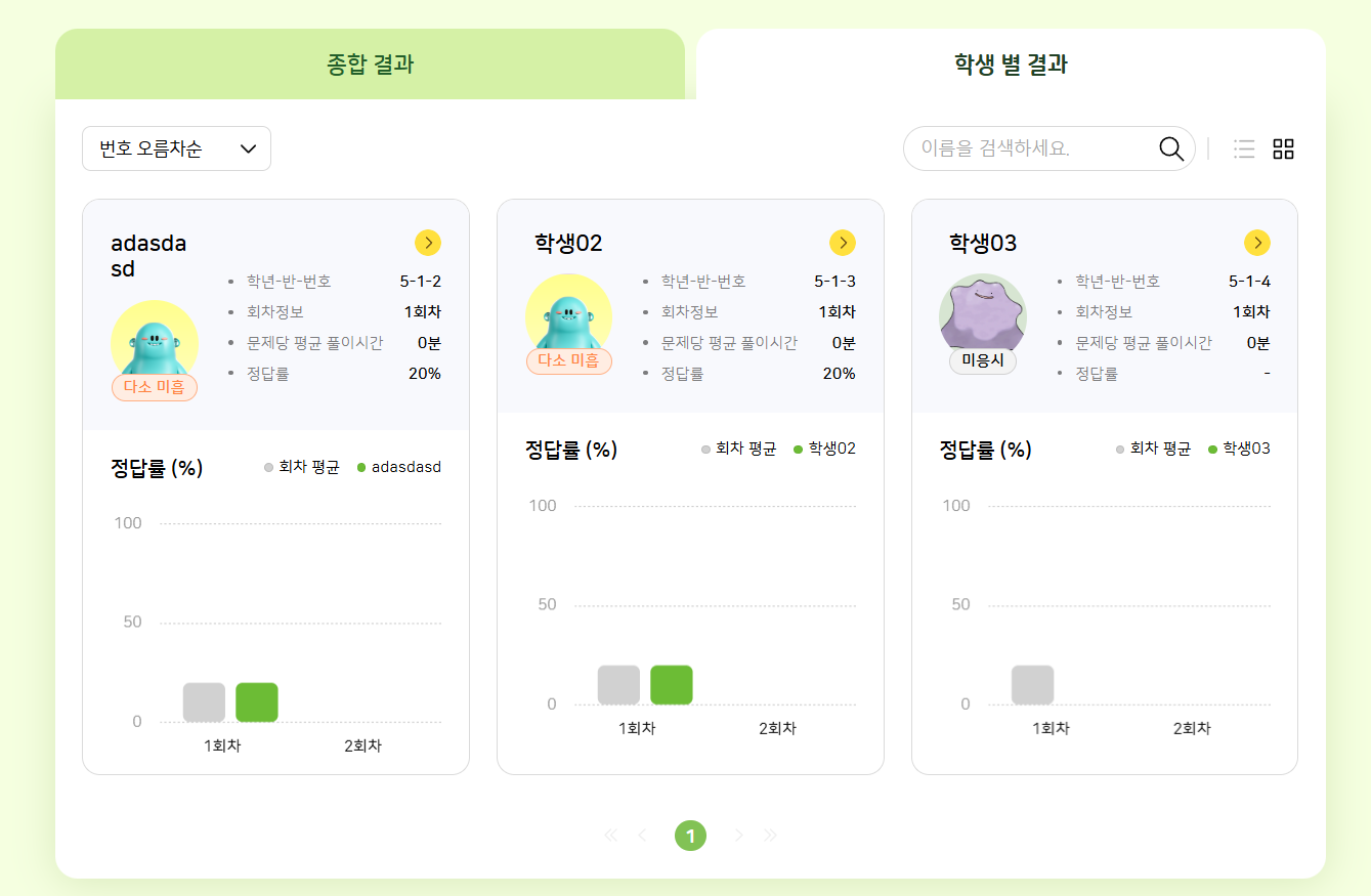 | Steps To Reproduce | 1. 교사 로그인 2. AI 학습 진단 > 학생 별 결과 3. 학생 이름 : adasdasd 확인 *adasdasd는 레벨4 캐릭터인데 레벨1로 노출 | ||||
