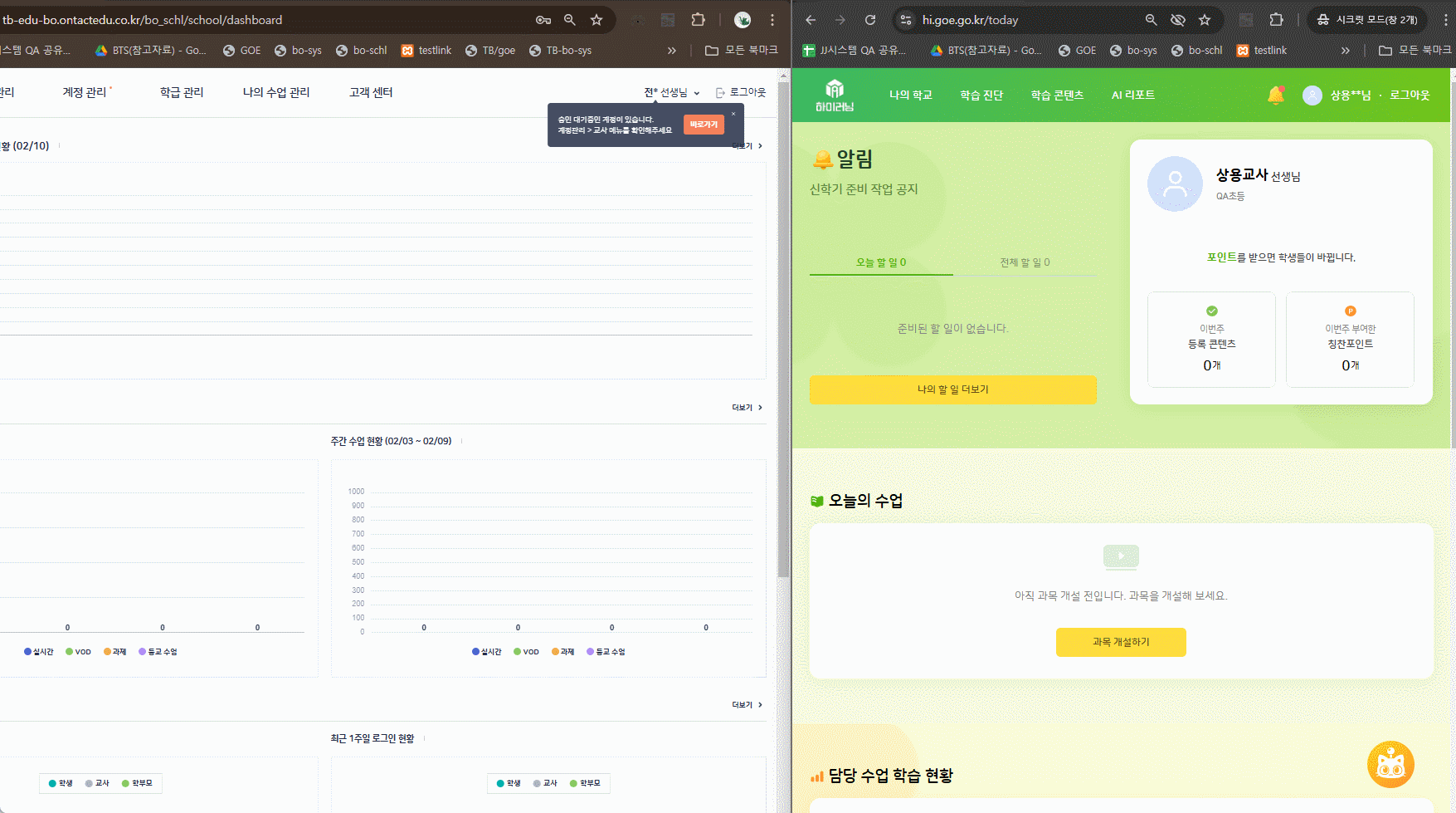 | Steps To Reproduce | 1. 학교BO 로그인 2. FO 로그인 > 관리자 홈페이지 진입 3. 중복 로그인 제어 동작 확인 | ||||