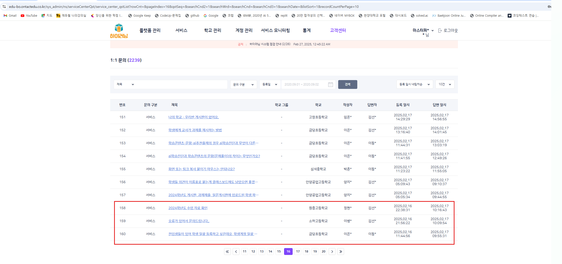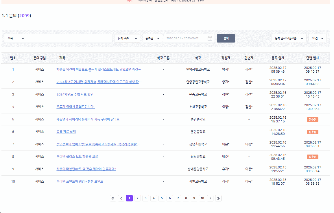상용에서 작성자 없는 문의 데이터 미노출 확인 |
