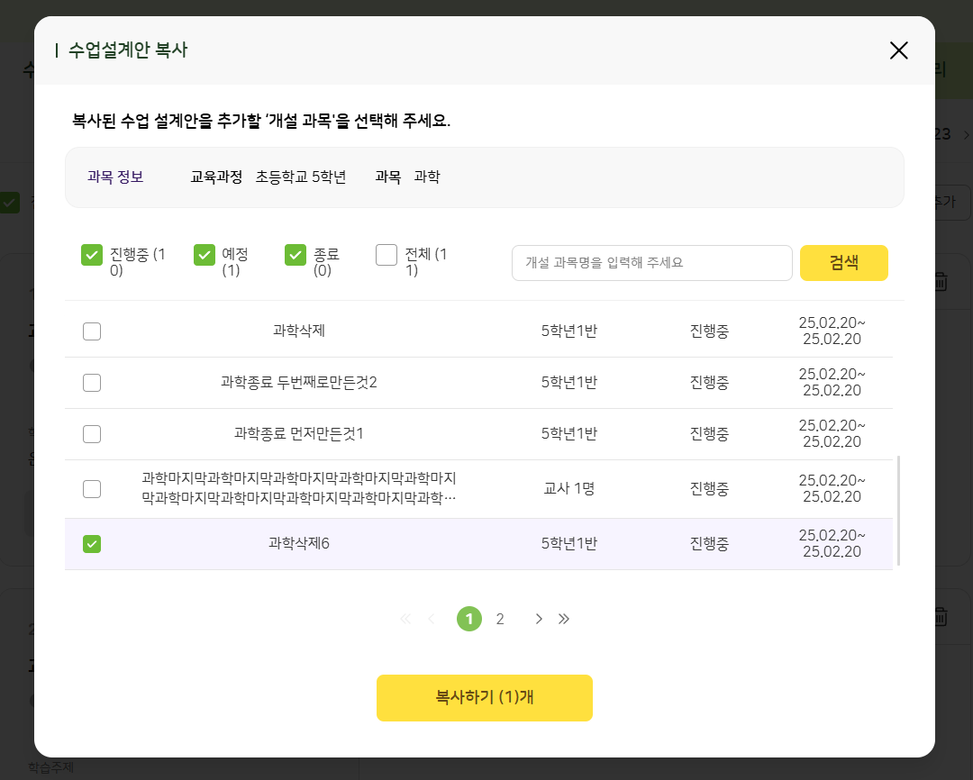 | Steps To Reproduce | 1. 교사 로그인 2. 수업 카드 > 수업 복제 아이콘 선택 3. 수업 설계안 복사 팝업 4. 페이지 확인 *과학삭제6 이라는 과목은 1페이지에도 노출되고, 2페이지에도 노출되고 있음 | ||||