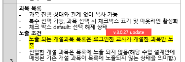 | Summary | 0000476: 로그인한 교사가 개설한 과목이 아닌 타교사 과목에 권한이 부여 될 경우에도 수업 복사 리스트에 노출되는 현상 | ||||