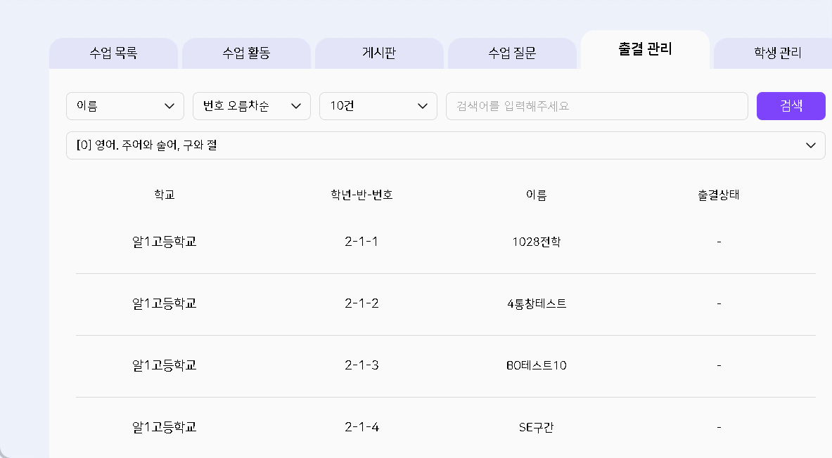 | Steps To Reproduce | 1. 수업 복사 > 복사된 수업이 생긴 과목-출결 관리 2. 수업 선택 드롭다운 클릭 3. 1번 차시 수업 클릭 4. 2번 차시 수업 클릭 5. 0번 차시 수업 클릭 | ||||