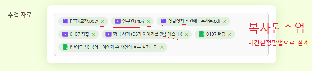 | Description | 복사된 수업을 '시간설정' 팝업으로 수업 설계할 경우 자료 순서 바뀌는 현상 *설계하기 버튼으로 수업 설계하면 자료 순서 바뀌지 않음 | ||||