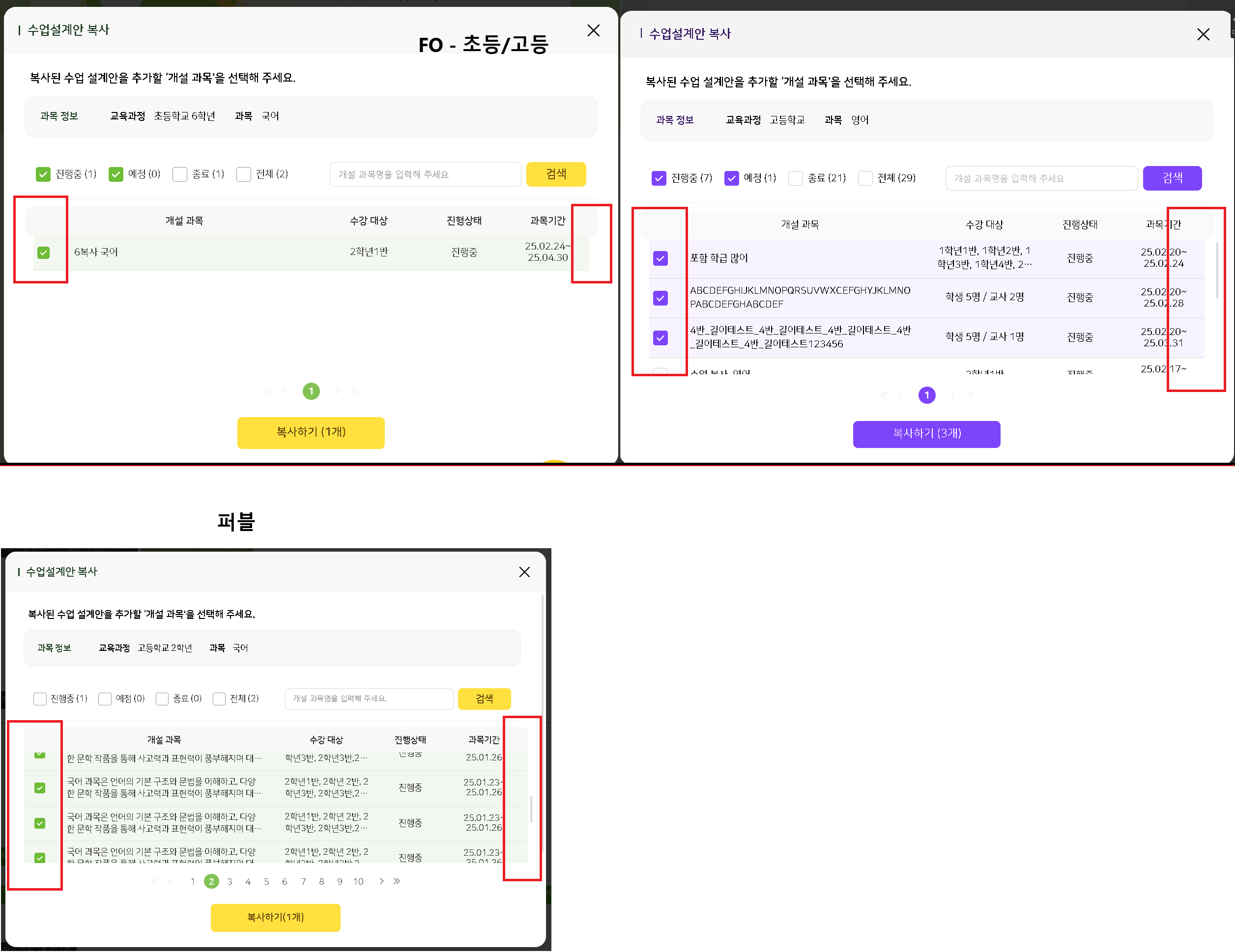 | Description | 수업 복사 팝업-개설 과목 체크박스 클릭시 선택된 과목에 하이라이트 되는 영역의 범위가 퍼블과 상이함 | ||||