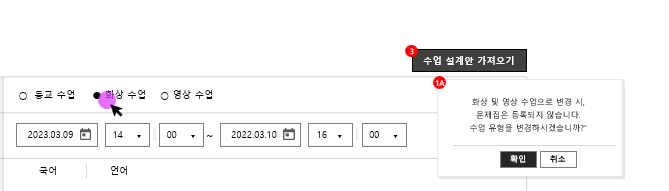 해당 디스크립션은 기존 수업 설정 화면([TEA-NON-LMS-001])을 참고하였으며, 담겨진 수업 자료에 대한 문제집 비활성화 처리는 별도의 디자인 및 퍼블 작업은 진행되지 않았습니다. 다만, 설계서 3.0.23 버전에서는 등교 유형을 ‘화상’ 또는 ‘영상 수업’으로 변경할 경우 Confirm 창을 노출한 후, 문제집이 삭제 처리되는 방식으로 정의되어 있으므로 확인 부탁드립니다. |