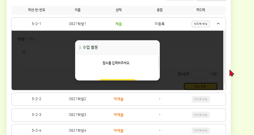 초과 배점 팝업 확인 점수 미입력 시 딤처리 및 팝업 오류로 리오픈 하겠습니다. |