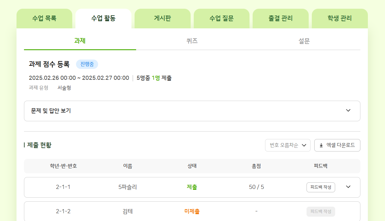 | Steps To Reproduce | 1. 교사 로그인 2. 과목 생성 > 수업 생성 > 수업 활동 > 과제 생성(배점 사용) 3. 학생 로그인 > 과제 제출 4. 교사 로그인 > 수업 활동 > 과제에 점수 등록 *이슈 : 교사가 과제를 5점 만점인 과제로 등록했는데, 학생에게 점수 부여할 때 50점(5점 초과)도 등록됨 | ||||