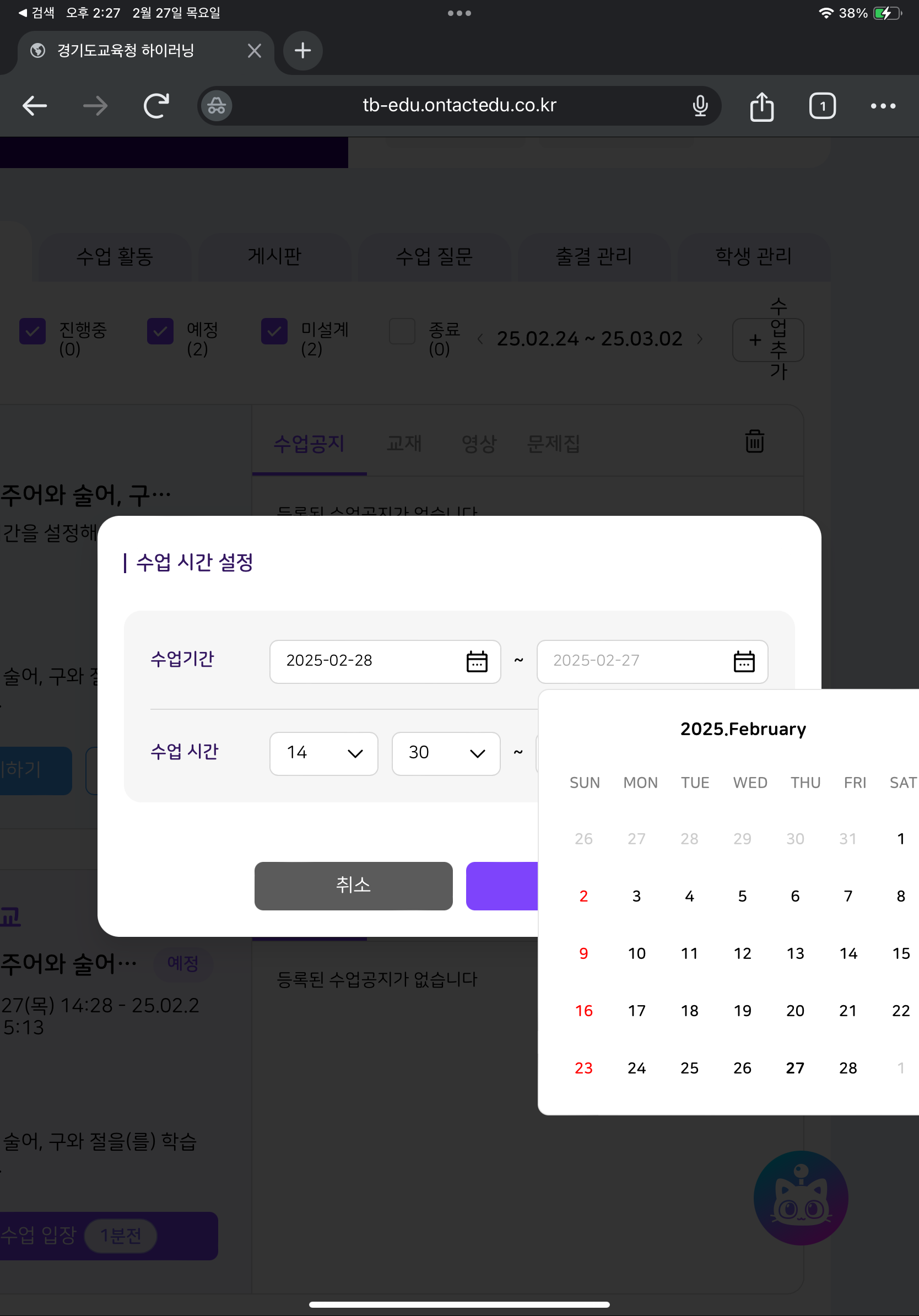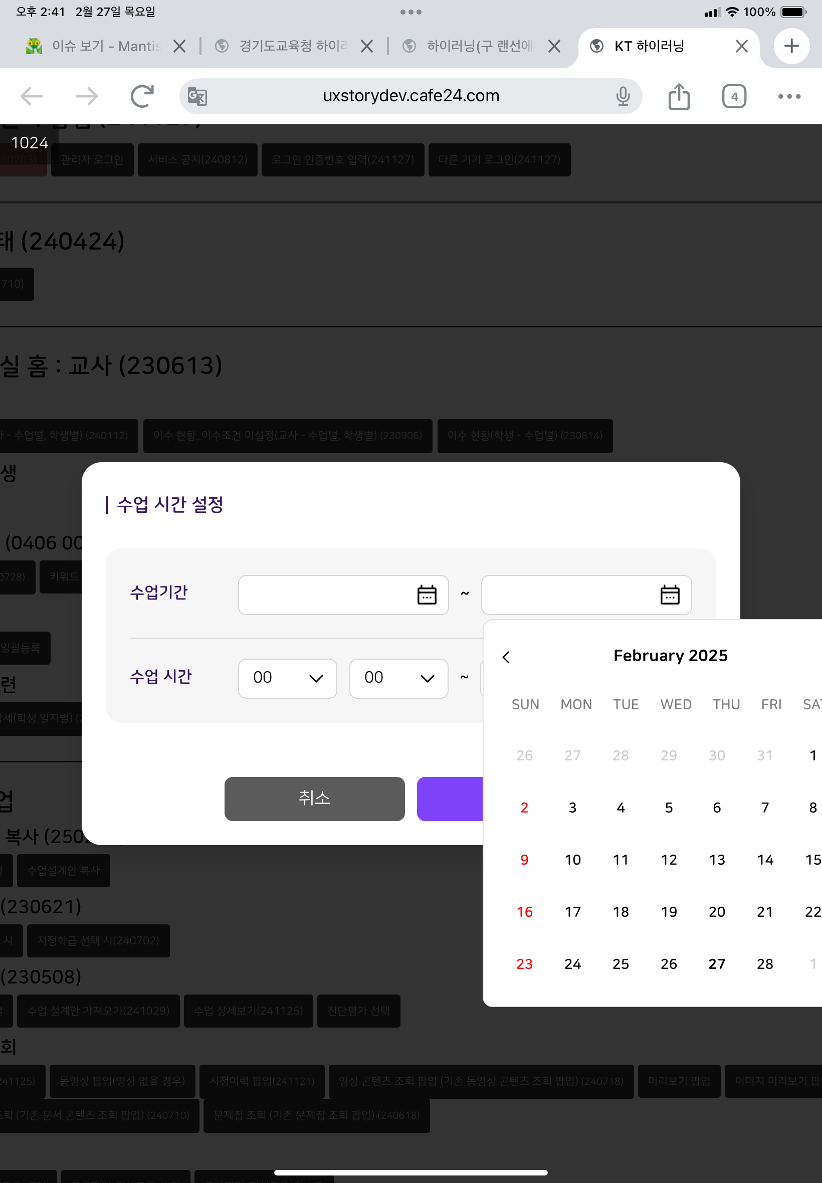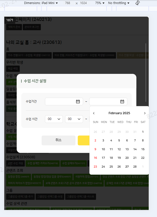 | Description | [ iPad ] 아이패드 세로모드 - 복제 수업 시간 설정 시 우측 데이트 피커가 잘리는 현상 ㄴ 다음달 선택 불가 - 스크롤 시 데이트 피커 종료 | ||||