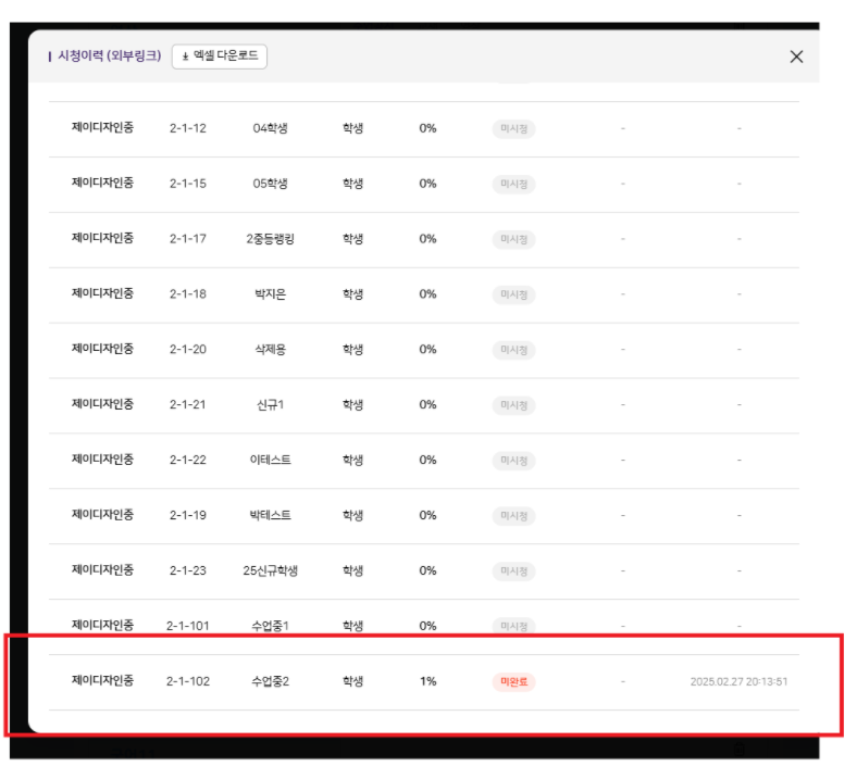 | Steps To Reproduce | 1. 영상 수업이 진행 중일 때 학생 추가 생성 2. 영상 수업 시청 이력 확인 | ||||