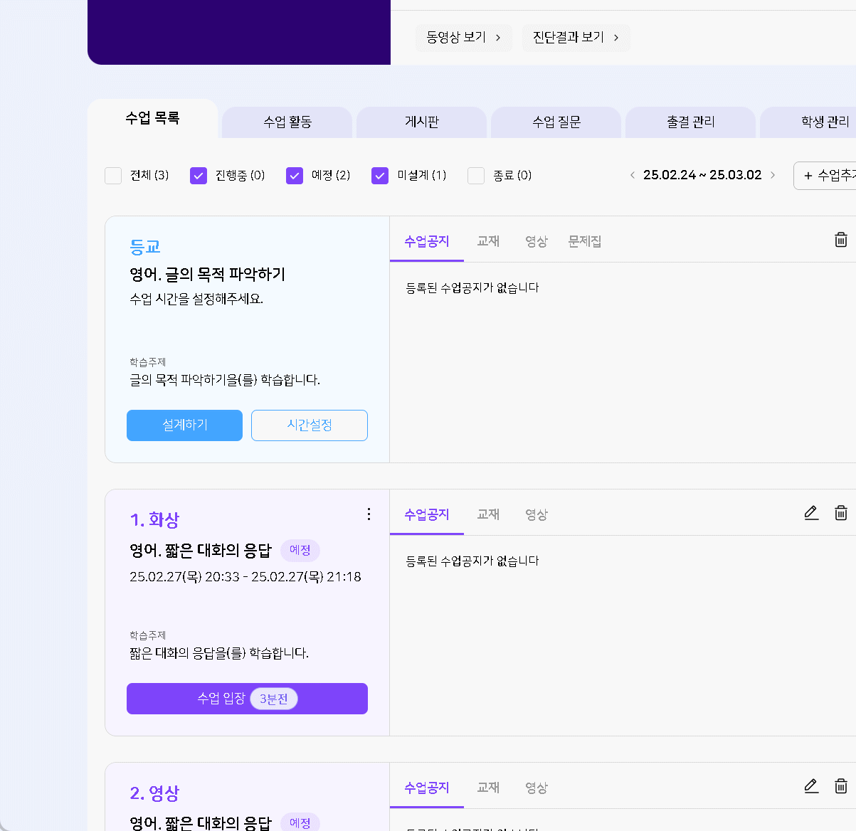 재현 스텝 1. A교사 과목 생성, A교사 수업 설계 (등교 + 문제집 포함) 2. A교사 과목 추가 생성 후 권한에 B교사 추가 3. 등교 + 문제집 포함 수업을 추가 생성에 복사 4. B교사로 해당 수업 시간 설정 |