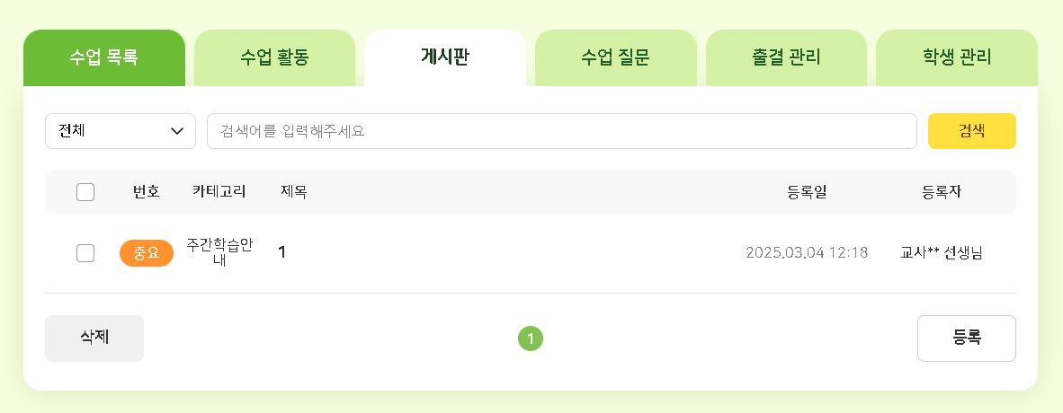 | Steps To Reproduce | 1. 교사 로그인 > 나의 수업 > 과목 상세 > 게시판 2. 등록 > 카테고리 : 주간학습안내 선택 > 게시판 목록 응시 | ||||