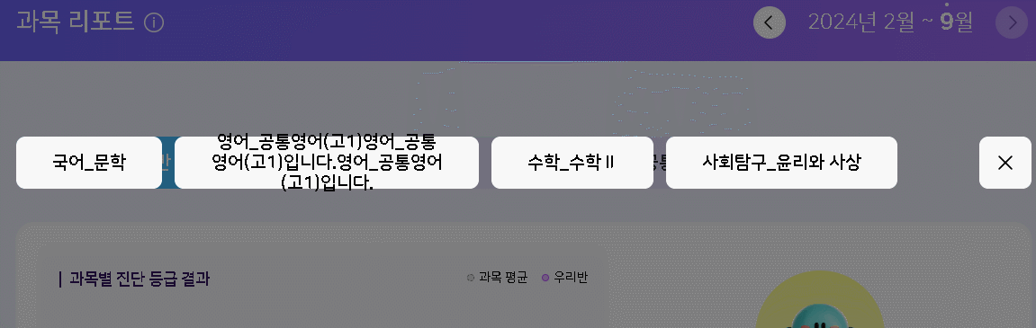 | Steps To Reproduce | 1. 교사 로그인 2. 상단 AI 리포트>과목 리포트 클릭(과목, 학생,종합 모두 문제됨) 3. 내가 개설한 과목 추가 버튼(+) 클릭 4. 버블 형태로 표시된 목록 클릭 | ||||