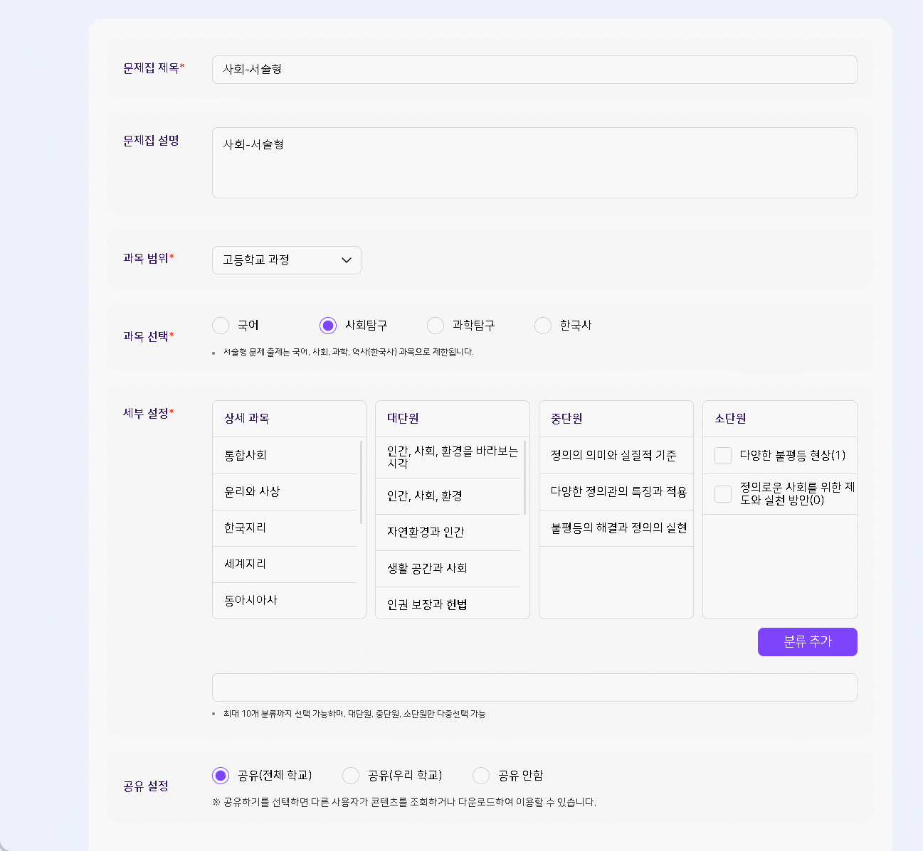 | Steps To Reproduce | 1. 교사 로그인 > 학습 콘텐츠 > 문항 등록하기 > 서술형 출제 2. 사회탐구 과목 선택 3. 세부설정 : 통합사회 - 인권 보장과 헌법 - 인권 문제의 양상과 해결 - 우리 사회의 인권 문제 선택 4. 세부설정 : 통합사회 - 사회 정의와 불평등 - 불평등의 해결과 정의의 실현 - 다양한 불평등 현상 선택 5. [다음] 버튼 클릭 6. "문제 은행" 영역 확인 7. 상단 "선택 범위"에서 선택 범위 하나 삭제 8. "문제 은행" 영역 확인 | ||||