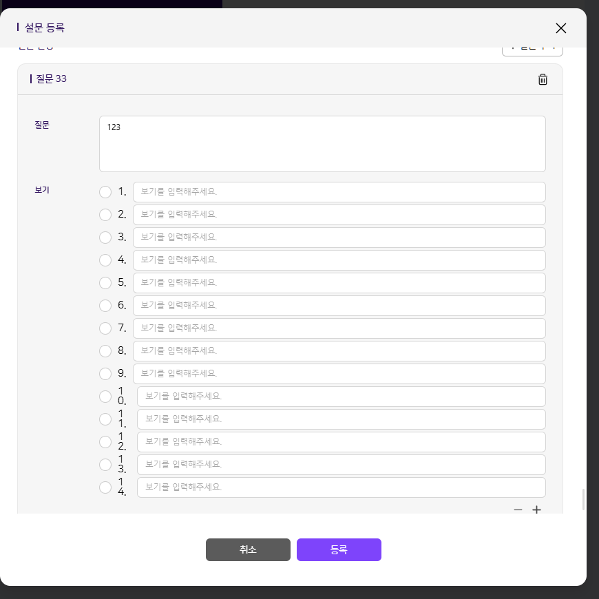 | Description | 과목 상세 > 설문 등록 시 보기가 두 자릿수 보기 줄바꿈 | ||||
