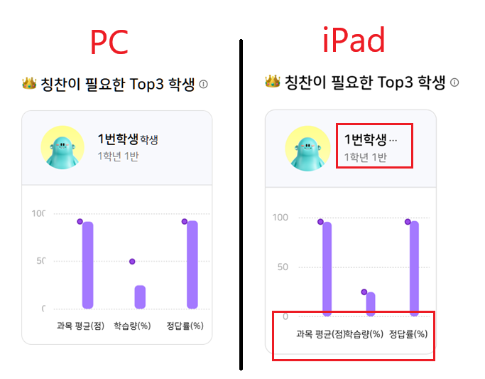 | Steps To Reproduce | 1. 아이패드 세로모드 2. 교사 로그인 3. AI 리포트 > 종합 리포트 4. 칭찬이 필요한 Top3 학생 영역 확인 | ||||