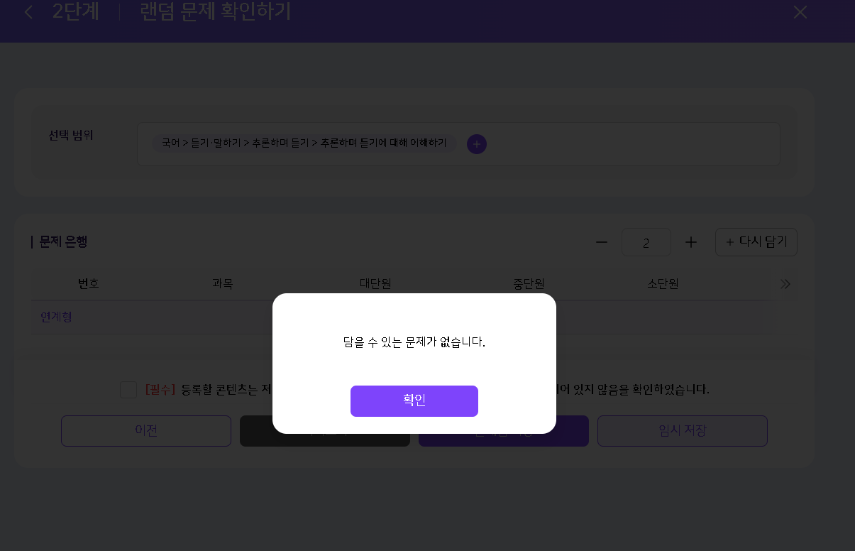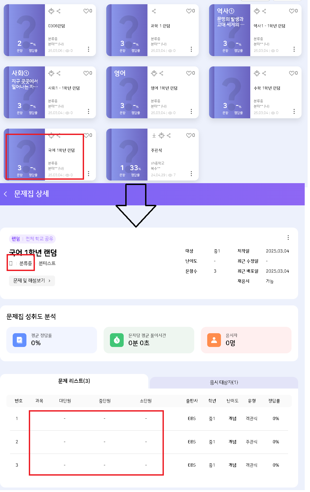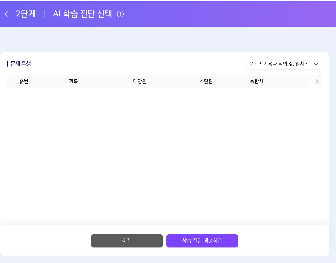 AI 학습진단 중1 - 국영수 3개과목 전부 문제은행 문제 없음 |