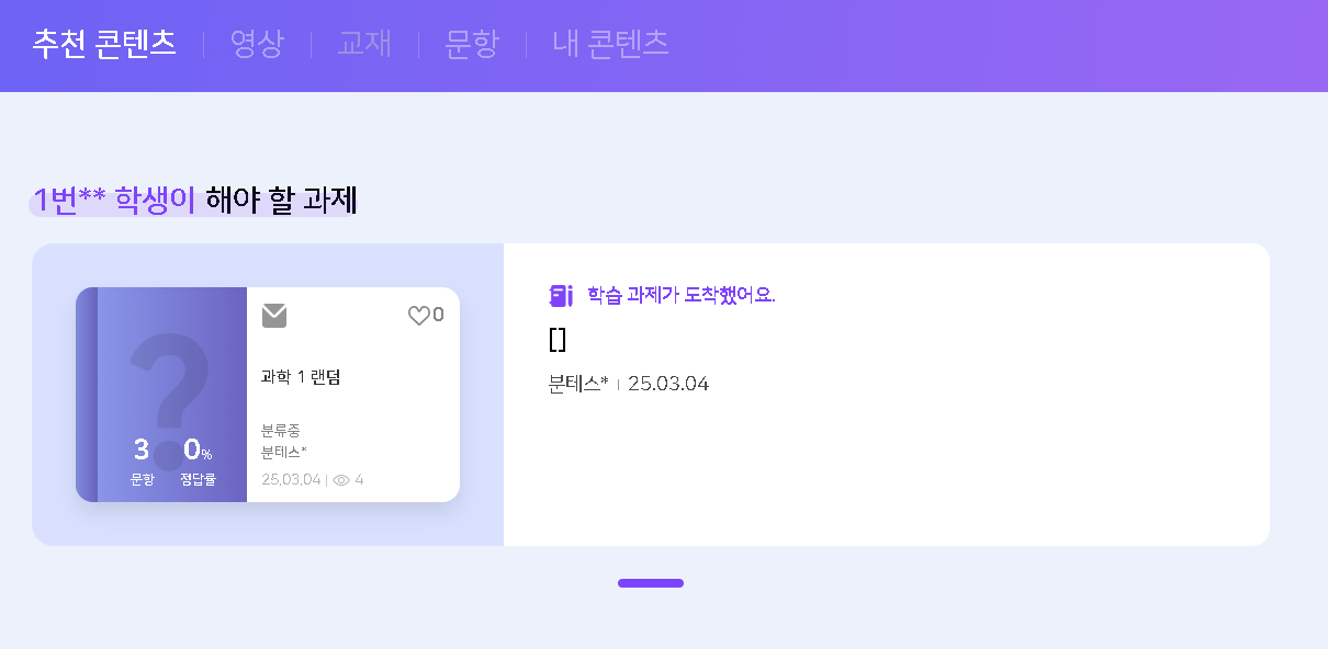 학생 - 추천 콘테츠. 분류 체계 전환 이전에 배포한 문항이 학생 추천 콘텐츠에 분류 체계 공란으로 노출됨 |