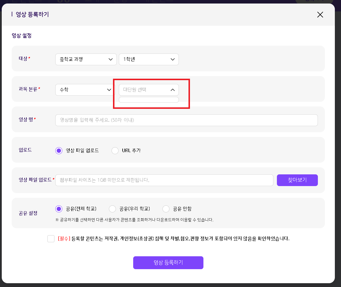 중1 교사 : 학습 콘텐츠 - 영상 - 영상 등록하기에 중1 수학 선택시 대단원 분류 없음 |